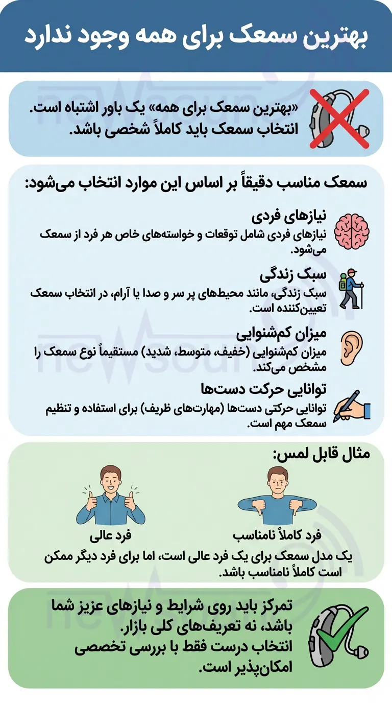 این شاید مهم ترین حرفی باشد که باید همین اول کار به شما بزنم. چیزی به اسم “بهترین سمعک برای همه” یک دروغ بزرگ است و بعدا خودتان هم به این حرفم می رسید!